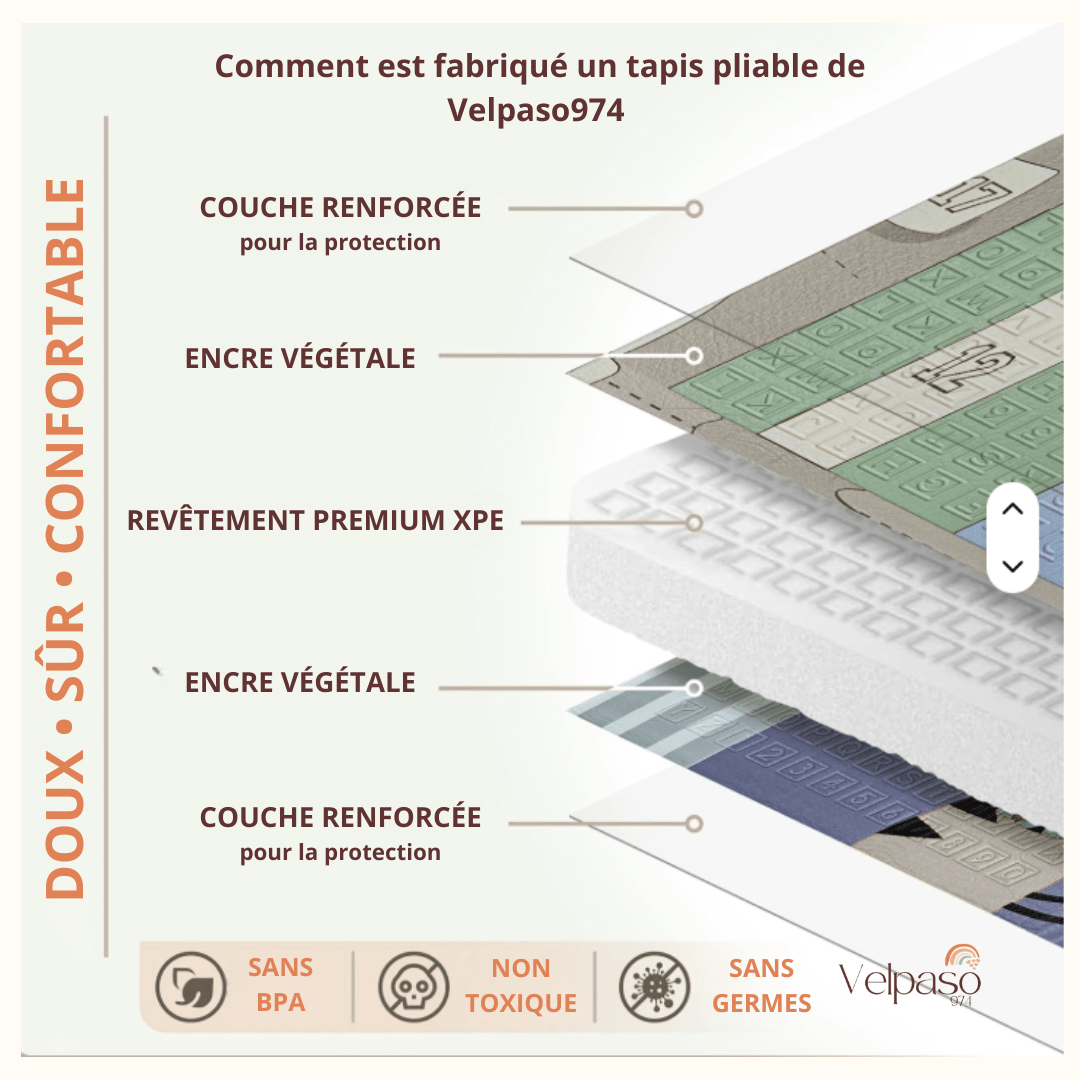 🌱 SAIN : Fabriqué avec des matériaux de qualité premium, notre tapis est conçu en mousse XPE respectueuse de l'environnement, sans substances nocives, sans formamide, ni phtalates et sans BPA. Vous pouvez ainsi avoir l'assurance que votre bébé joue dans un environnement sûr.